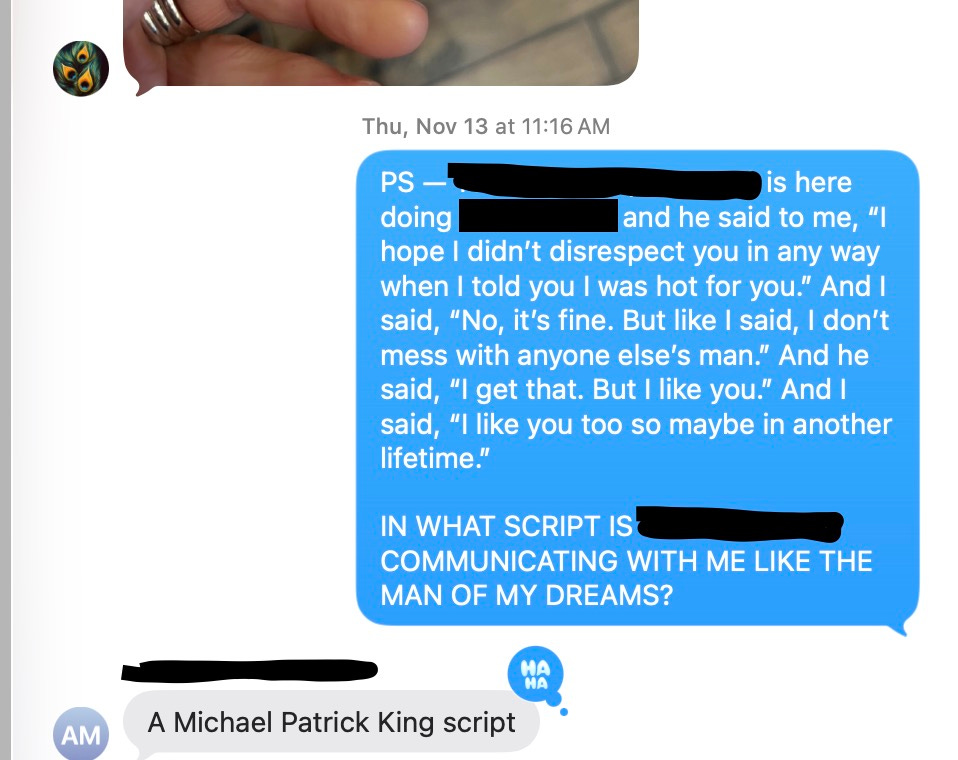 Let’s hold up for a moment so I can reiterate this: I am not interested in fucking my pool guy. However, given some of the nonsense that faces single folks my age? Sounds like a pretty sweet, if not fantastical, scenario to joke about. The following occasion, when Pool Guy was doing some work at my house, he repeated how he wanted me to know that when we last spoke, it was not his intent to disrespect me, so we went down that rabbit hole for a hot second, again. A text to a friend afterwards.