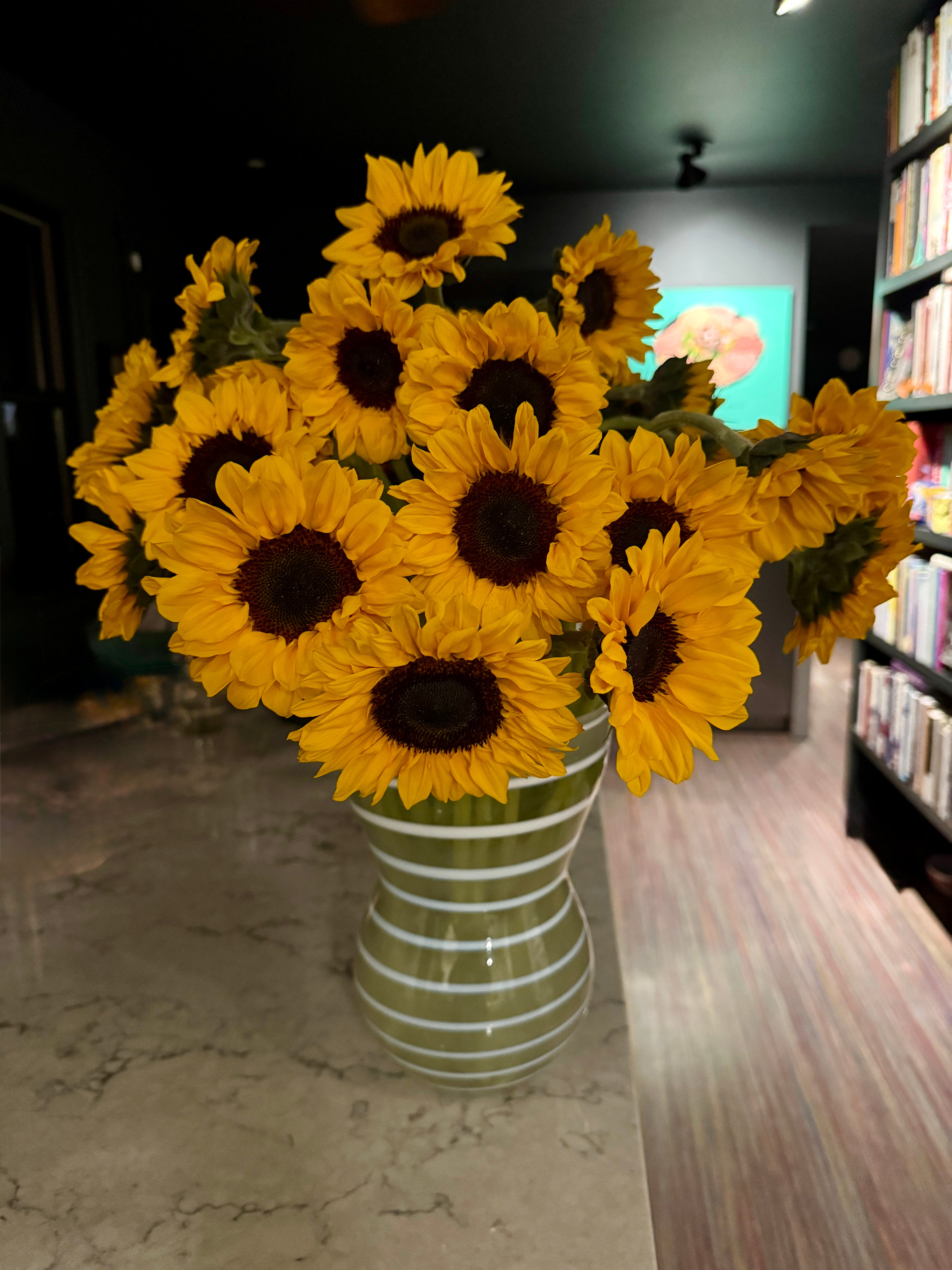 My pals Michael and Mark LOVE a good mystery, and so after the sender was def. MIA, they started sleuthing, saying, “Hey! Check your outside security camera! At least you can see who delivered them!” Good idea. FedEx was the delivery source and further snooping turned up that the bouquet (40 sunflowers!) were from the bulk flower section at Costco.