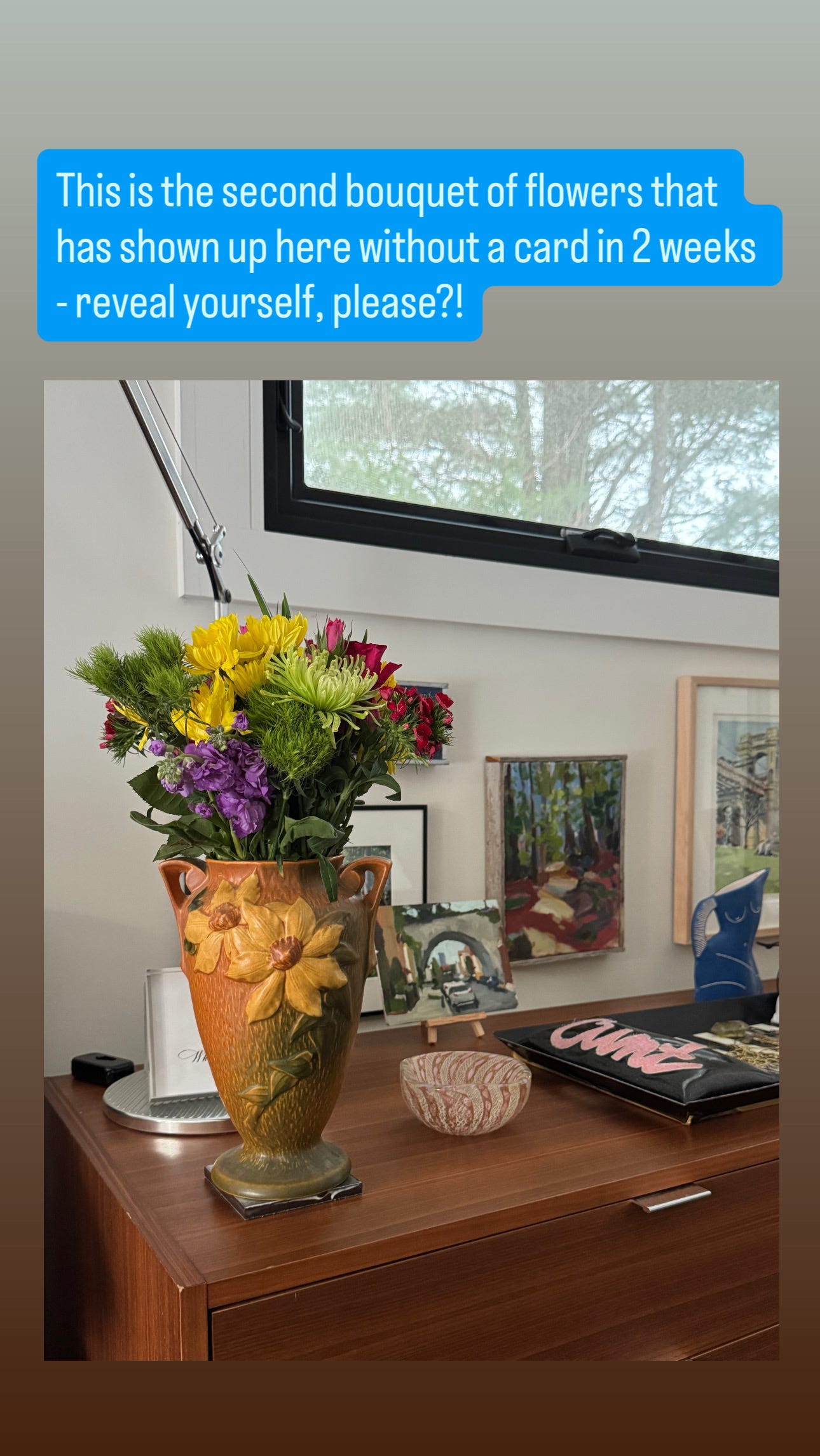 Yes, another Mystery Bouquet was delivered but this time, I was home to receive it. Yup, Costco. Yup, no card. So I posted this on social media.